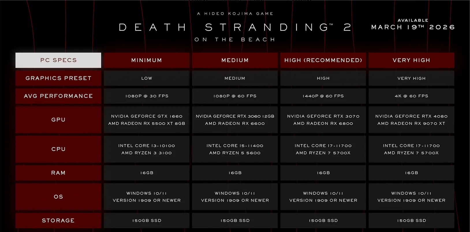 * Теперь, когда мы знаем, что компьютерная версия Death Stranding 2: On the Beach выйдет 19 марта сего года, самое время посмотреть на системные требования игры. Которые, следует признать, являются достаточно бюджетными. За исключением самого навороченного уровня. Но этого и следовало ожидать.