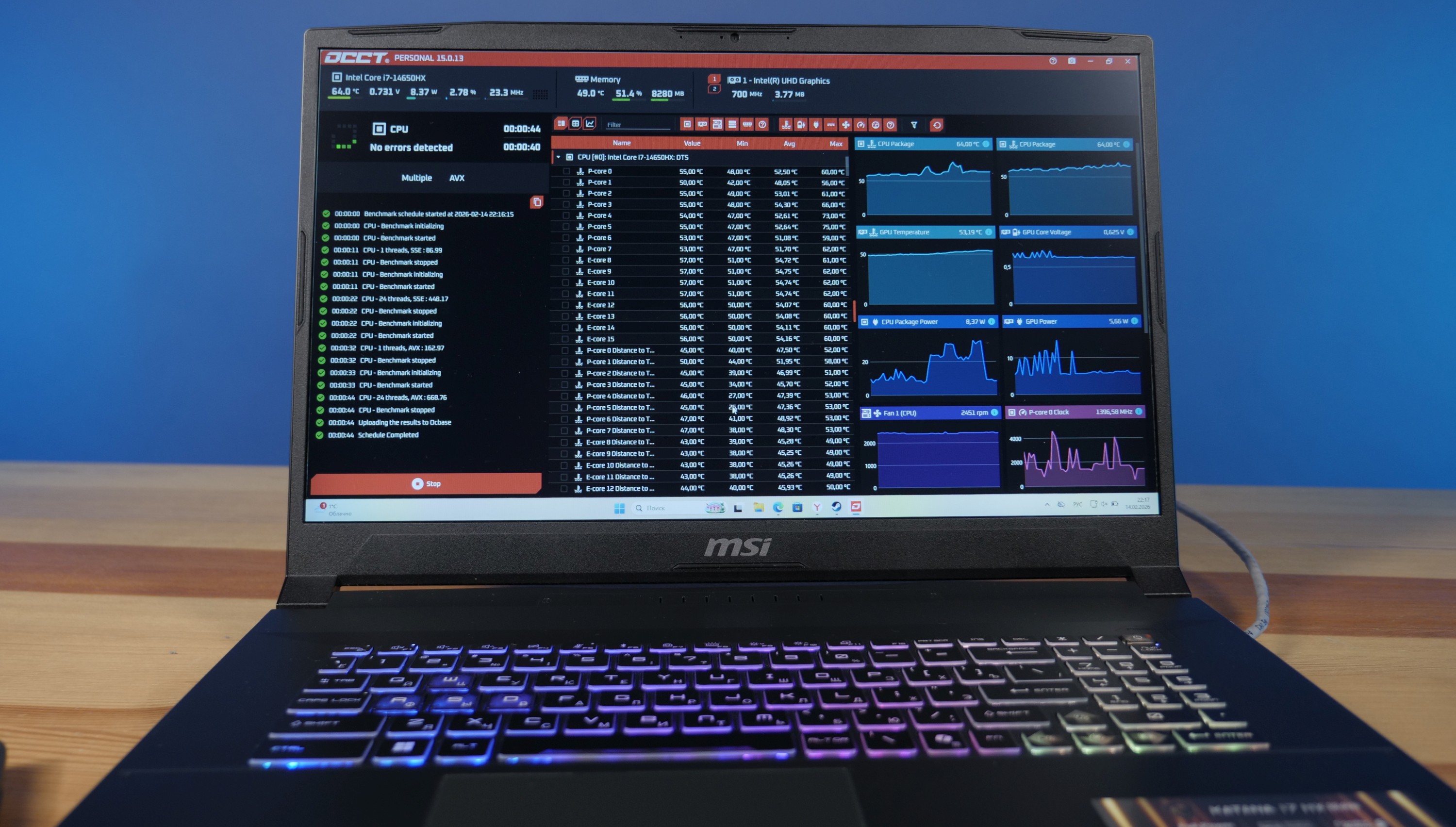 Приятно удивил нас и тест стабильности через OverClock Checking Tool – несмотря на нагрузку процессор и видеокарта избежали каких-либо колебаний температуры и вольтажа. Очевидно, что эта заслуга системы охлаждения Cooler Boost 5 и отлично продуманной электрической части.апоследок отметим время автономной работы. Для MSI Katana 17 HX B14W этот показатель равен пяти часам, но, разумеется, не под высокой нагрузкой.