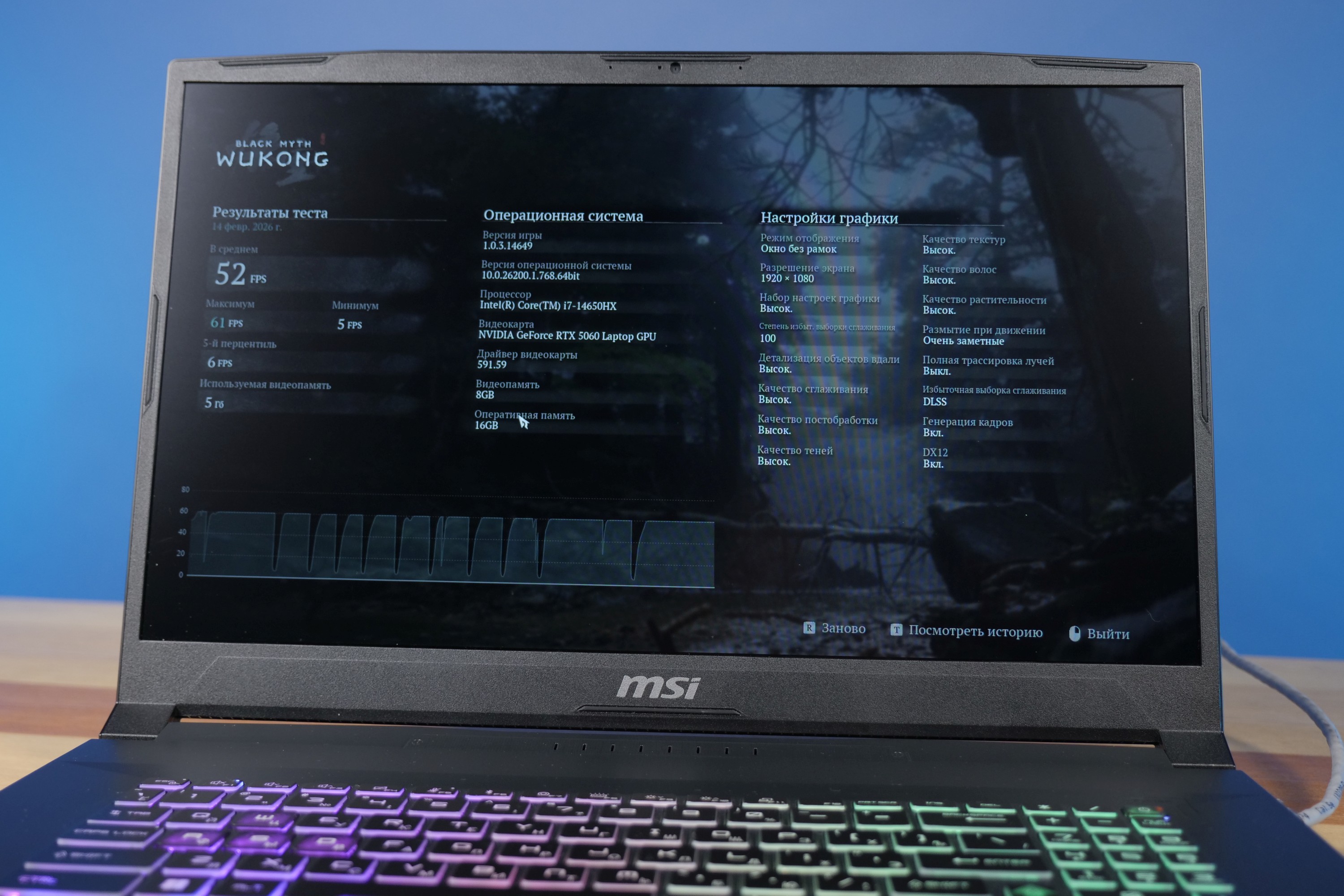 Intel Core i7-14650HX – это процессор с 16 ядрами (8p + 8e) и частотой до 5,8 Ггц. Видеокарта NVIDIA GeForce RTX 5060 выполнена на архитектуре Blackwell и поддерживает технологии DLSS4 и MaxQ. В контексте видеоигр все упомянутое приводит к тому, что MSI Katana 17 HX B14W демонстрирует внушительную производительность.