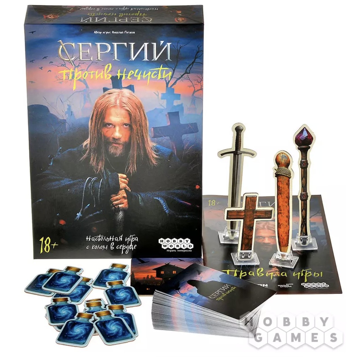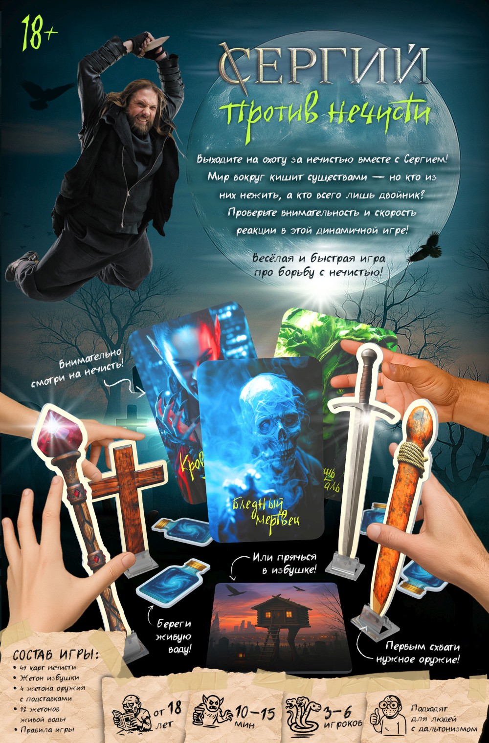 Настолка «Сергий против нечисти» обещает перенести участников в мрачный и опасный мир, где потребуется обнаруживать монстров и побеждать их правильным оружием: против вампиров пригодится кол, против призраков - крест, кикимор и лесавок усмирят меч и посох. А в случае наступления темного шабаша героям придется прятаться в избушке. То есть игроки окажутся внутри тех же легенд и фольклорных столкновений, которые когда-то впервые появились на экране.