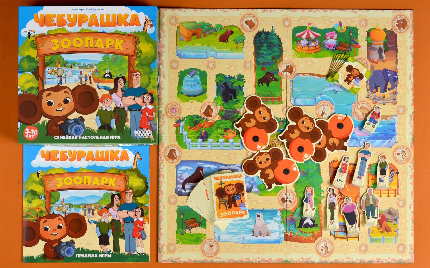«Чебурашка: Зоопарк» – лёгкая и динамичная игра-бродилка для детей, которая перенесет вас в мир доброго мультфильма. Игроки выбирают одного из восьми персонажей и отправляются исследовать зоопарк, посещая разнообразных животных. Ваша задача – быстрее всех находить нужных зверей и делать их фотографии. Это не только увлекательно, но и полезно – игра развивает внимательность, пространственное мышление, учит счету. Простые правила делают игру доступной даже для самых маленьких настольщиков, а яркое оформление и объёмные фигурки добавляют ей очарования!