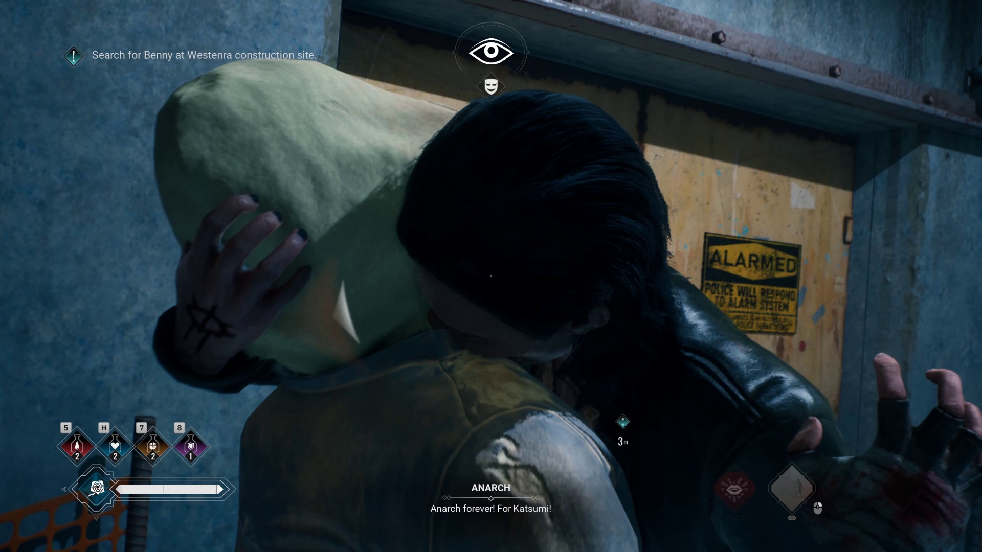 К счастью, между миссиями в Bloodlines 2 выпускают побегать по открытому миру Сиэтла. Честно говоря, содержательных занятий тут немного: такого параметра как «деньги» в игре нет, так что грабить прохожих бесполезно, а чтобы насосаться крови, хватит пары-тройки бомжей – то есть задача это буквально на 20 секунд. Еще можно подраться с рандомно спавнящимися противниками, или поискать граффити, повышающие максимальное здоровье Кочевника. Все это, в принципе, ерунда – но сама возможность побегать по городу, залезть по водосточной трубе на крышу, перелететь с одного здания на другое – все это позволяет передохнуть между миссиями, и их линейность воспринимается уже проще.