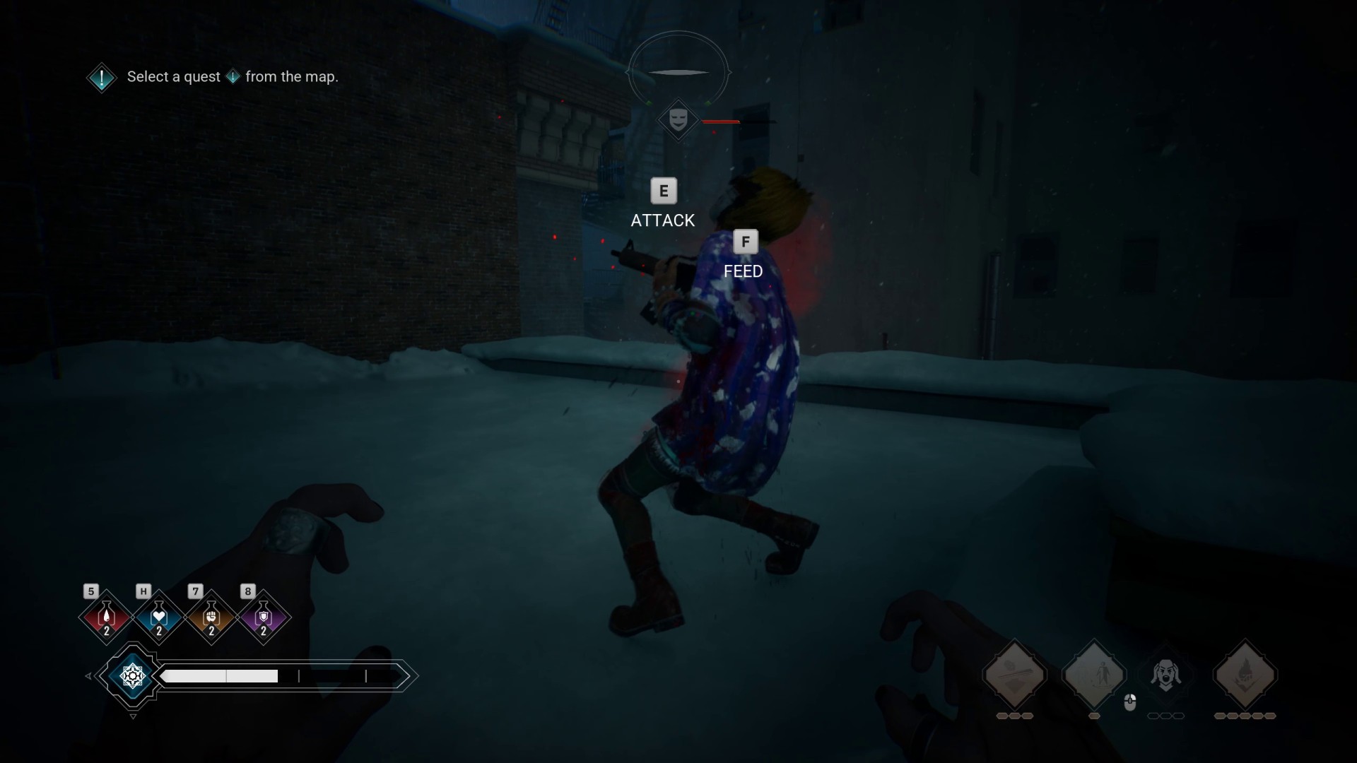 Еще одним достоинством неожиданно оказалась боевка. Да, с точки зрения логики происходящего она странная, поскольку Кочевник не носит с собой вообще никакого оружия. Если ему попадется ствол – он из него постреляет и тут же выбросит; а найденную заточку или биту просто метнет во врага. Поэтому любую схватку мы начинаем с голыми руками да арсеналом вампирской магии. А вот у противников никаких ограничений нет: у них могут быть и биты, и огнестрел, и взрывчатка.
