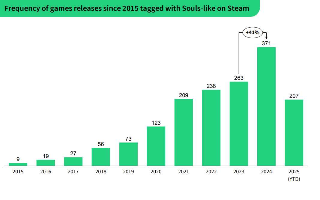 * Количество клонов Dark Souls в Steam с 2015 года росло по экспоненте, и к 2024 году выросло с 9 до 371 (это в год, а не всего). Однако в нынешнем году наметился регресс. На данный момент вышло «всего» 207 игр в подражание Dark Souls, и до прошлогоднего показателя практически наверняка добраться не выйдет. Неужели интерес к жанру пошел на спад?.. Такую вот проблему обозначило исследование компании VG Insights.
